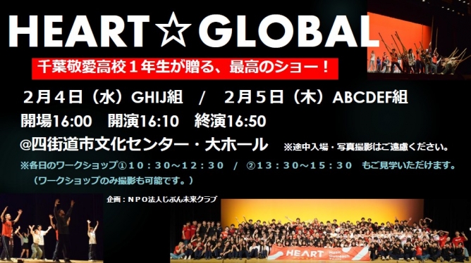 1学年では、2月4日(水)と5日(木)四街道市文化センターで「HEART☆GLOBAL」(ハートグローバル)を実施いたします。「HEART☆GLOBAL」は、Hope (希望)とEmpowerment(元気づける) through ART (芸術を通して)から考案されている企画です。外国人キャストたちと一緒に歌やダンスを通じ、最後にショーを作り上げていきます。